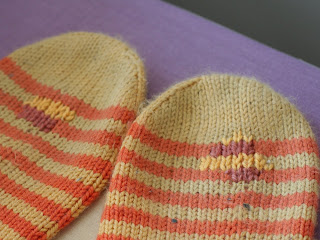 Nuo kelta-oranssit sukat saa mut aina niin hyvälle tuulelle, että päätin parsia ne. Keltainen on alkuperäistä lankaa, oranssia ei enää löytynyt, joten korvasin sen marjapuuronpunaisella.